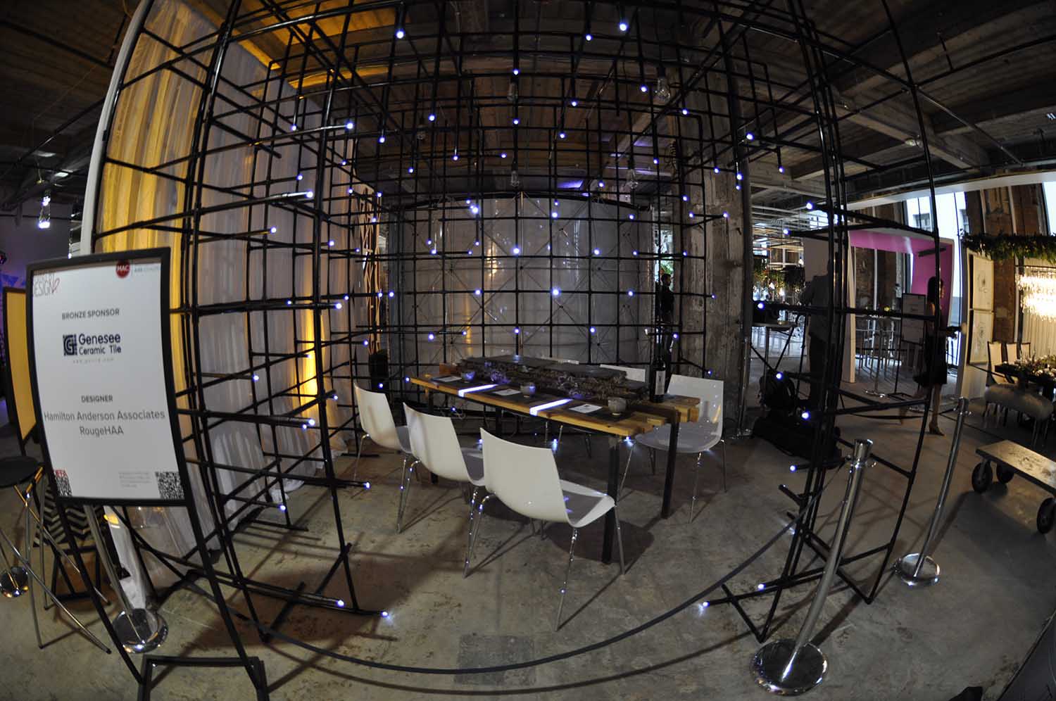 Dining by Design brings together a variety of international and local designers to create dining installations that awe, inspire, and delight. Each team was responsible for developing a dining installation that pushed the concept of using basic dining furniture such as tables, table settings, chairs, floors, lighting, including the vignette. Our concept was to define a space within a deconstructed cube using salvaged materials. This concept was reflected in the materials selected by the team – recycled PVC pipes were weaved into a delicate black lattice-patterned vignette. Sequentially, LED lights were strategically placed within the pipes to visually define the space by directing the visitor’s focus through illumination. The dining furniture reinforced the concept through carefully selected pieces. The dining table was created by Workshop Detroit, who utilized reclaimed wood from vacated Detroit homes.