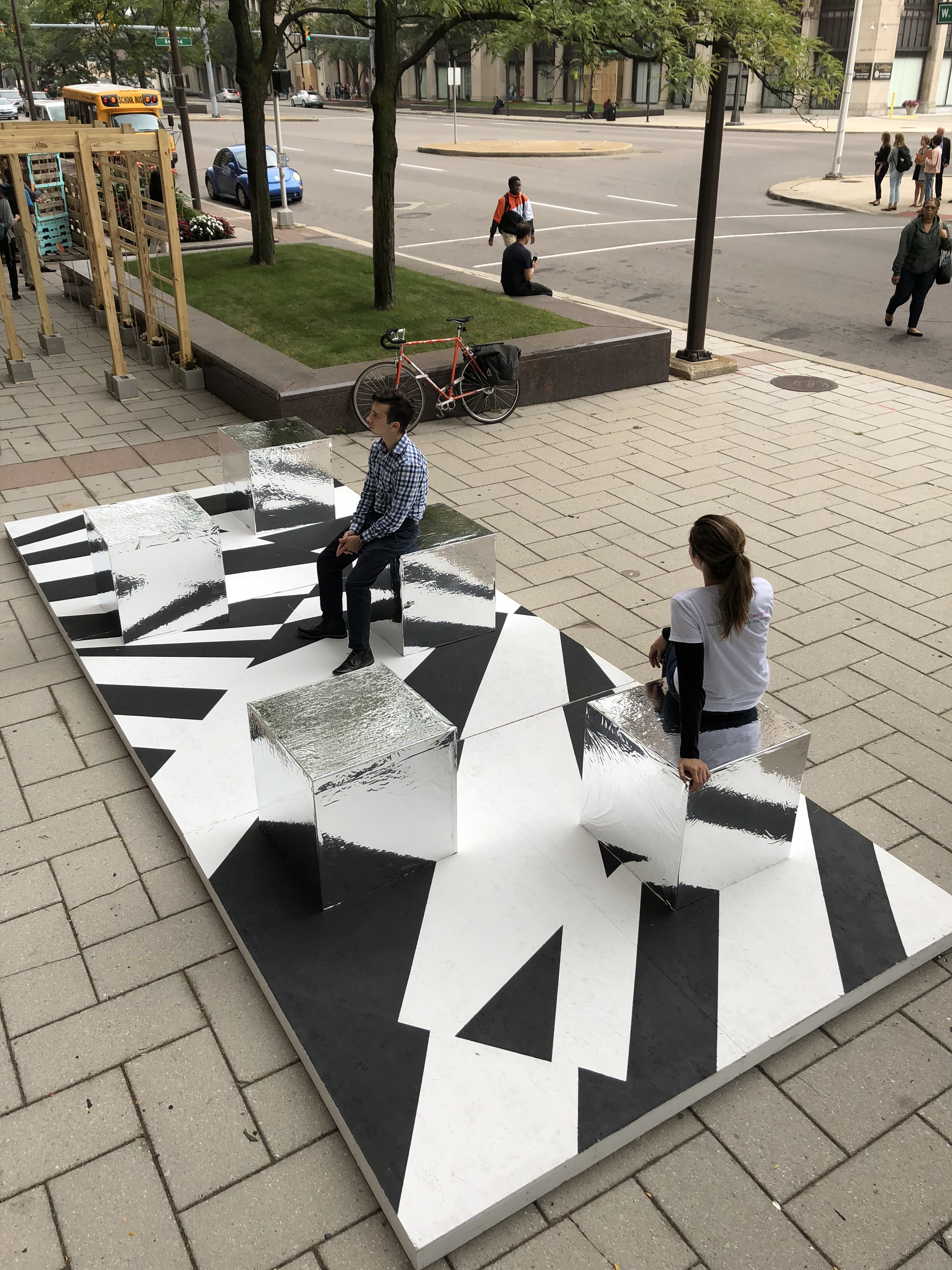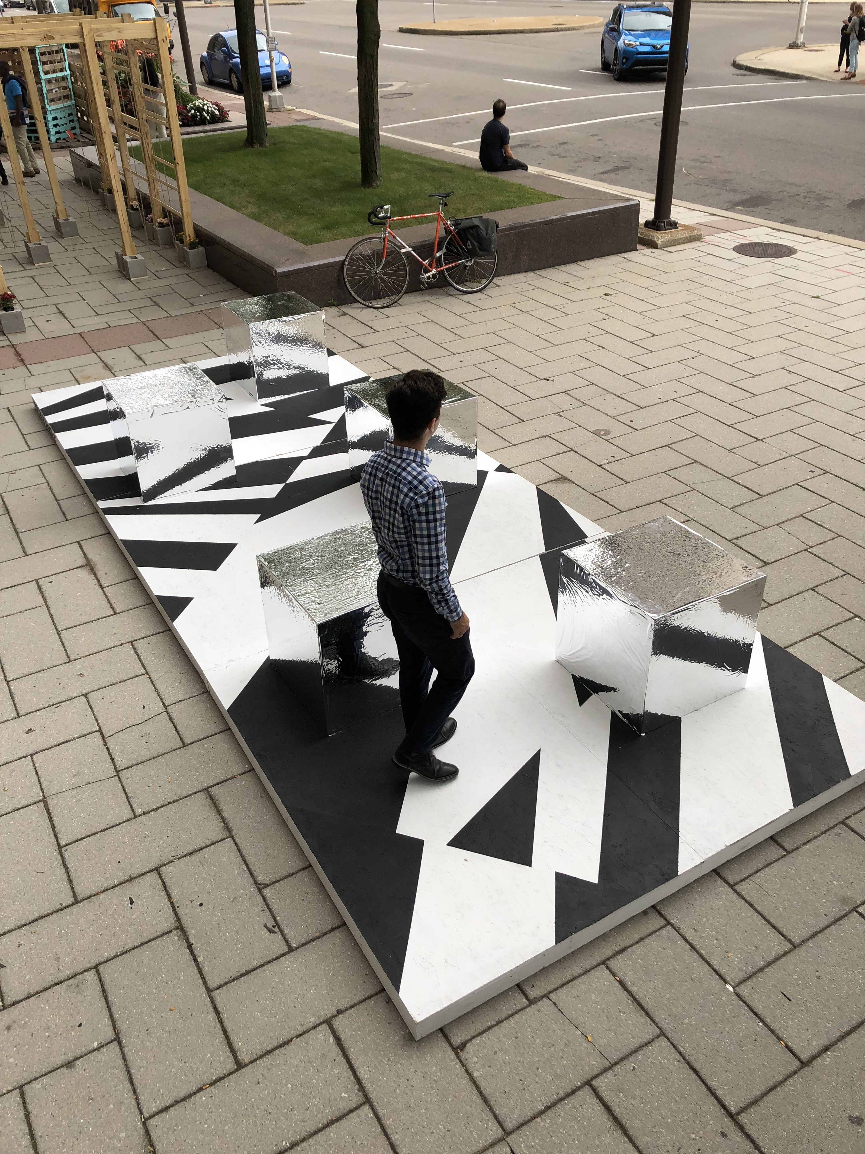 In the context of this project, Dazzle patterning is applied to a large platform as a means to disrupt the passerby. Reclaimed 2’ x 2’ plywood cubes provide seating for an adjacent bus stop. The cubes are clad in reflective film and seemingly disappear in juxtaposition with the floor. Similar to “Cloud Gate” (nicknamed “The Bean”) in Chicago’s Millennium Park, the reflective surfaces also draw in the surrounding context, offering glimpses of buildings, sky, and street activity.